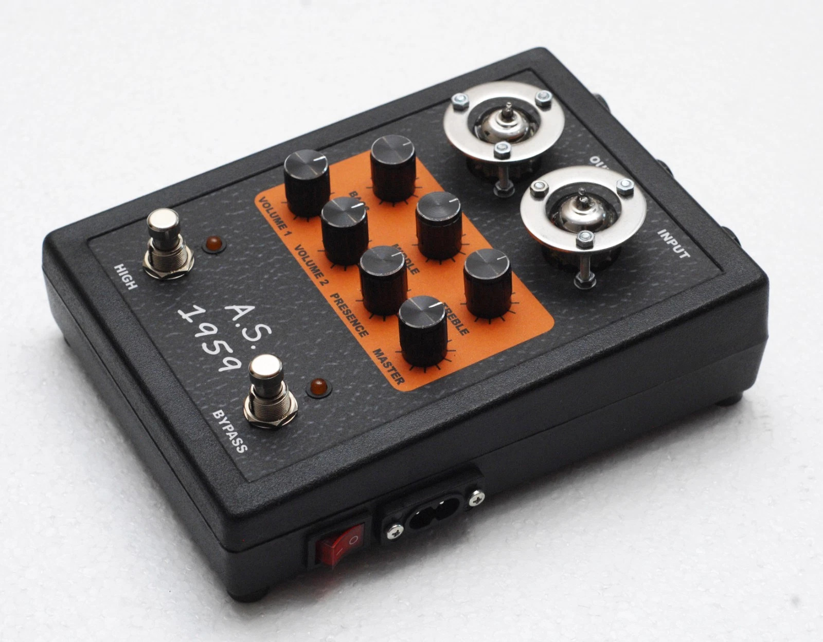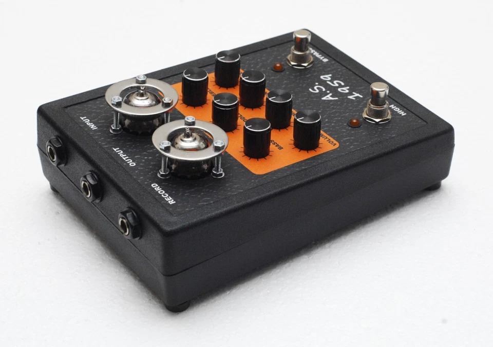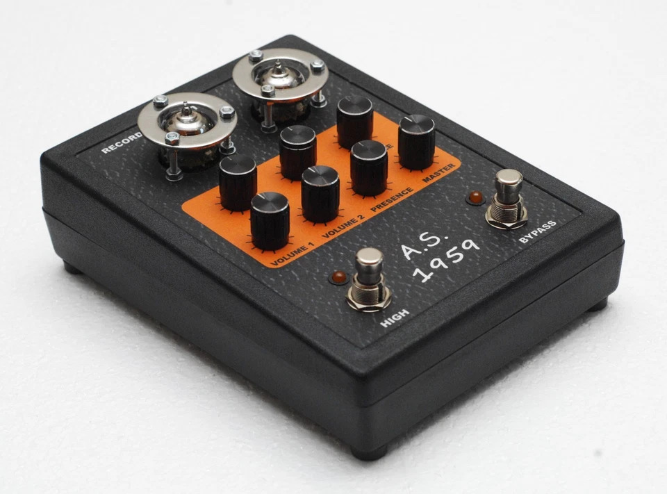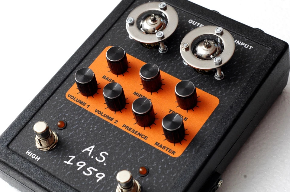 Это преамп от Маршалловского усилителя JMP Super Lead, модель 1959 (это не год выпуска). Два канала запараллелены на входе и выбор осуществляется через гейны. Можно оставить только яркий канал "VOLUME1",
